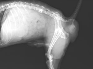 レントゲン画像では通常とは異なる位置に糞便の陰影が見られます。