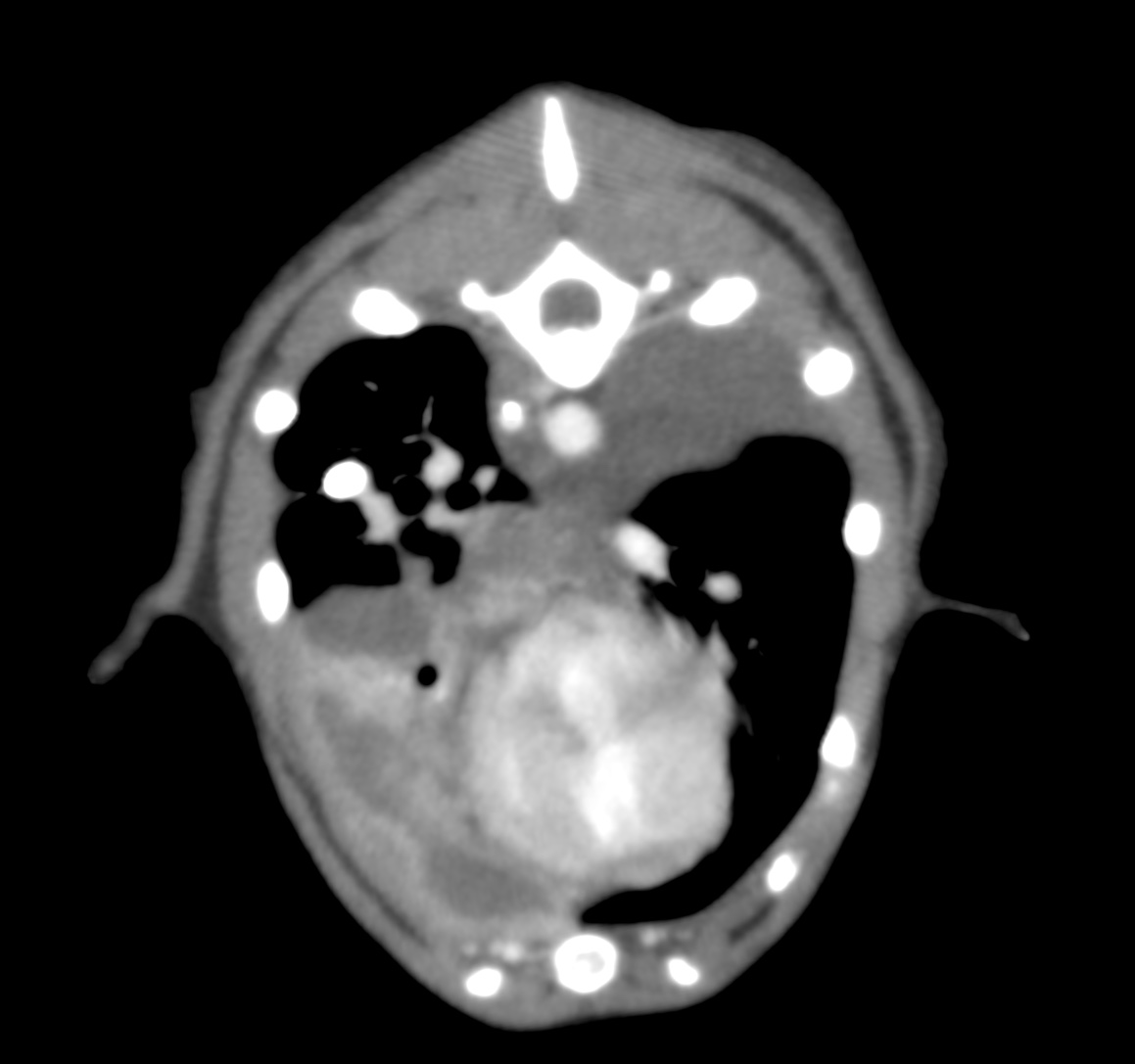 血液検査や超音波検査での腹腔内臓器に大きな異常はありませんでしたが、胸部レントゲン検査で肺の一部に白くなっている部位がありました。CT検査を予定していたのですが、数日の内に破裂してしまったため、胸腔ドレーンを設置し排膿および抗生剤治療を行いました。1週間ほどで体調は良くなり、食欲や元気も戻ってきました。