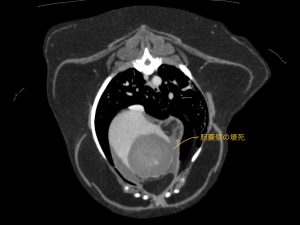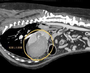 今回治療させて頂いたワンちゃんは、胆嚢粘液嚢腫の経過観察中に胆嚢破裂が生じ、緊急手術を行いました。胆嚢は粘液貯留により重度に拡張し、胆嚢壁の血流が悪くなり壊死が生じた結果、破裂していました。手術で胆嚢摘出を行ったあと、数日は胆汁性腹膜炎が続きましたが、術後6日で無事に退院されています。