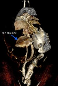 手術では、右の腎臓が10㎝以上の大きさに腫れており、中に赤黒いゼリー状の物質が詰まっていました。腫瘤は、後大静脈や左結腸動脈などの血管とべったり張り付いており、慎重に剥がして無事に摘出できました。