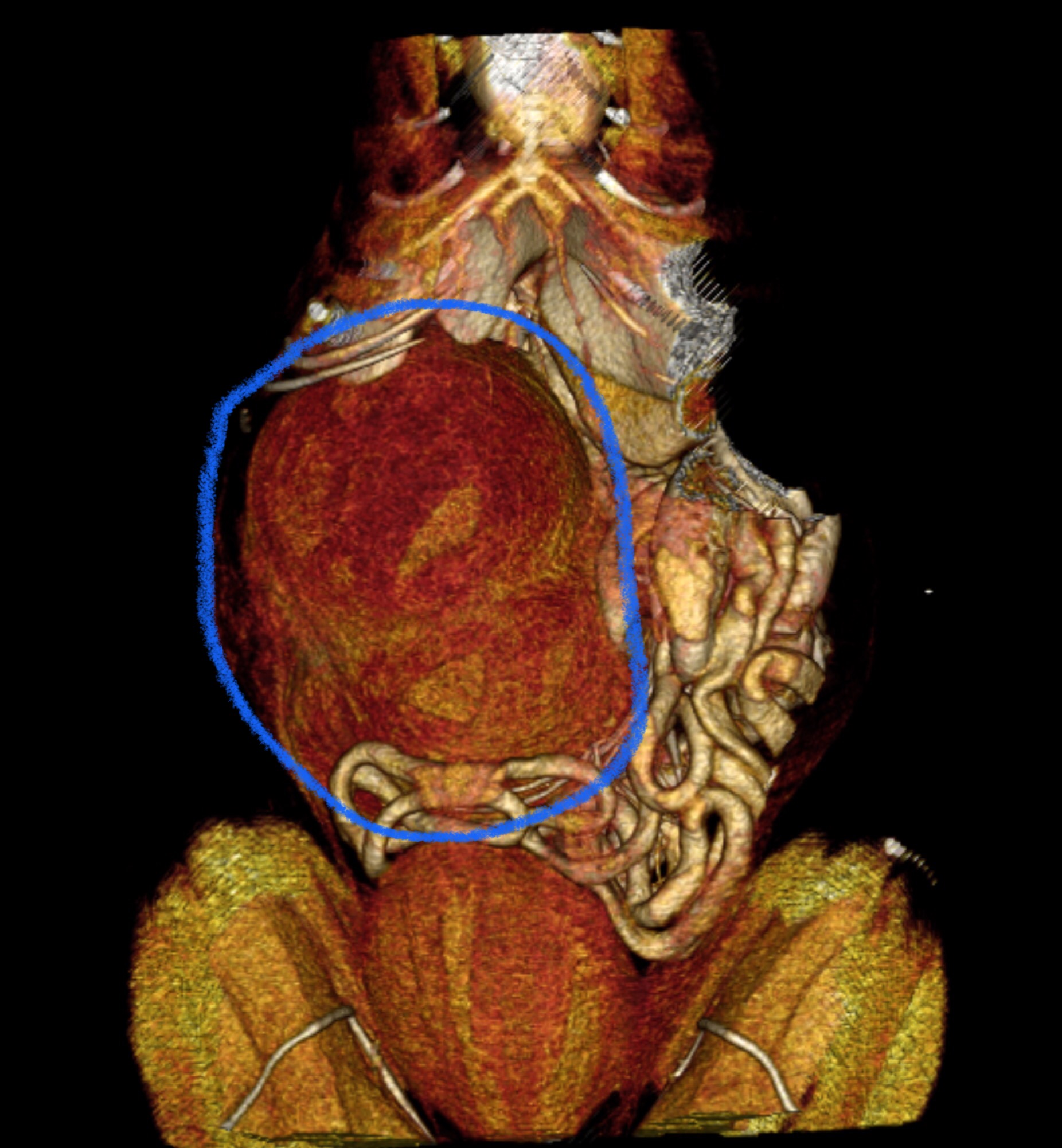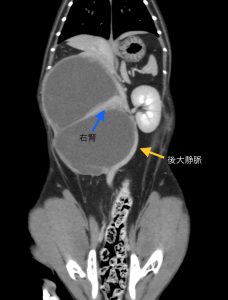 X線検査とエコー検査では、腫瘤が大きすぎて右区域の肝臓腫瘍か腎臓腫瘍か分からず…CT撮影と手術について説明させて頂き、翌日手術を行いました。