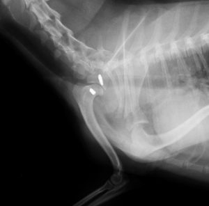一般的には、関節周囲の内側か外側の靭帯を損傷にてしまった結果、肩関節の脱臼を起こしています。診断は関節の触診とレントゲン検査でわかる場合や、鎮静麻酔下で、透視検査によって関節の亜脱臼が見つかる場合と程度によって様々です。