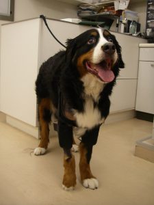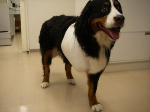 このため、中大型犬においては、長期的な抑制は現実的に無理な場合が多く、本院ではそれぞれにあった足かせバンテージをオーダー(冒頭の写真)してもらい装着しています。これをつければ、手術した足もほぼ普通に使用しつつ肩の運動を抑制することができます。